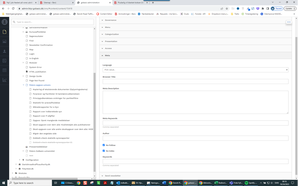 2. Check outså de interne admin-sider/ backend sider. Måske bliver sider som fx "Categorizations" mv. også indekseret. Det er dog ikke alle sider, som har en sådan "Meta-data" fane under settings. Eksempelvis bliver siden "HTML-publikationer" (som ikke bliver brugt og er tom) muligvis også indekseret, hvilket ikke giver mening.